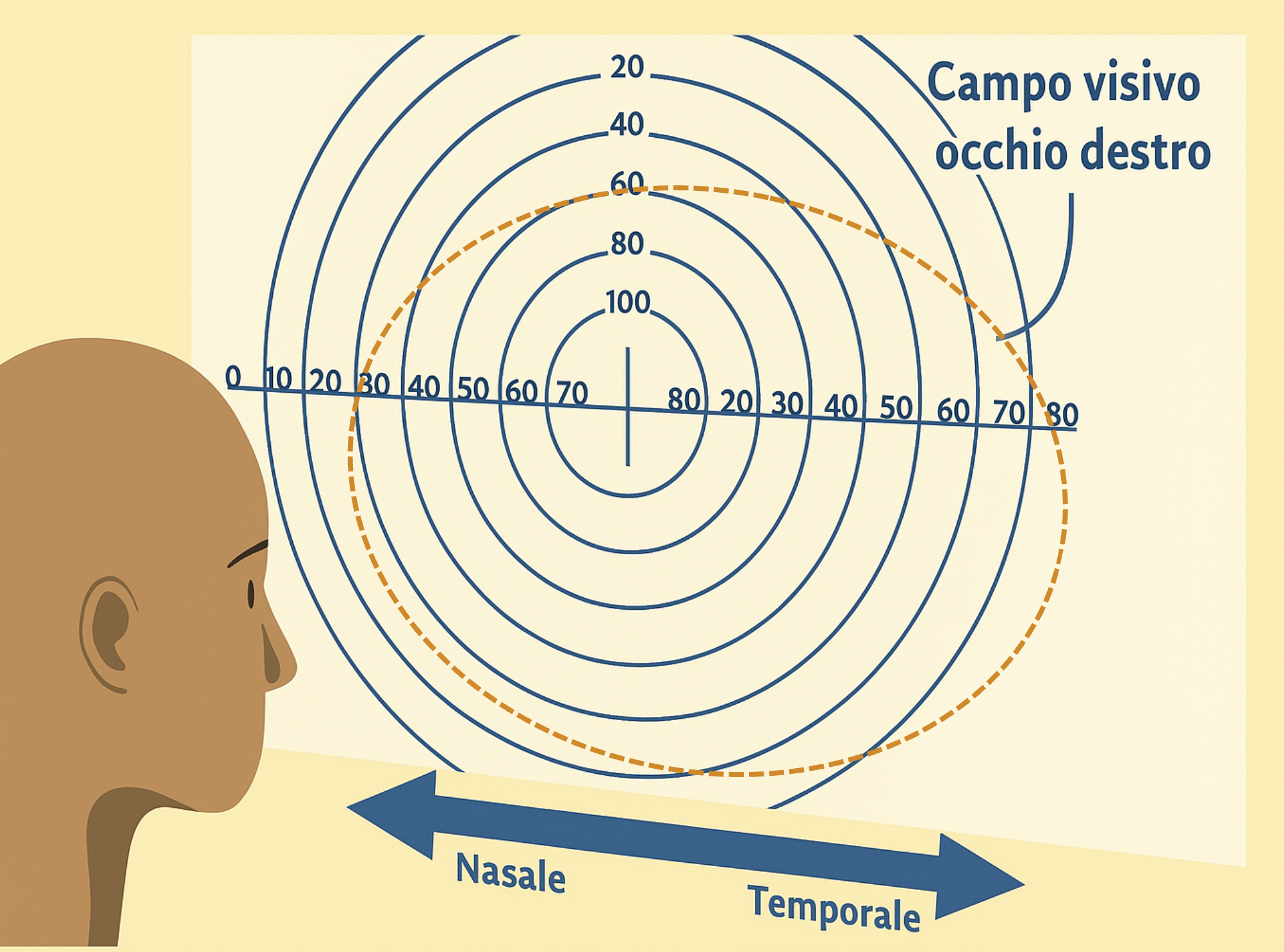 Il campo visivo è, in parole semplici, tutto ciò che i tuoi occhi riescono a vedere quando guardi un punto fisso davanti a te, senza muovere gli occhi. Non si tratta solo di ciò che vedi chiaramente al centro (quello che chiamiamo visione centrale), ma anche di tutto quello che riesci a percepire attorno, ovvero la visione periferica.